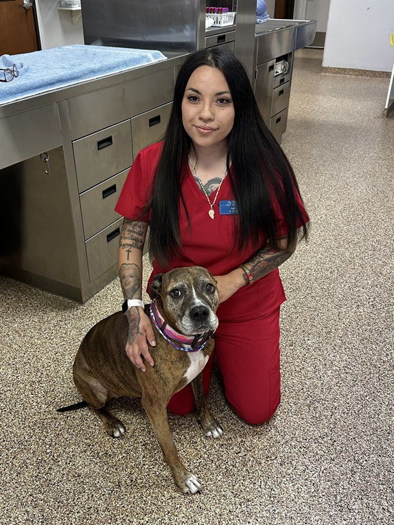 When at home she enjoys spending time with family, hiking, and fishing. She also loves cuddling with her dog Darvina (seen here).